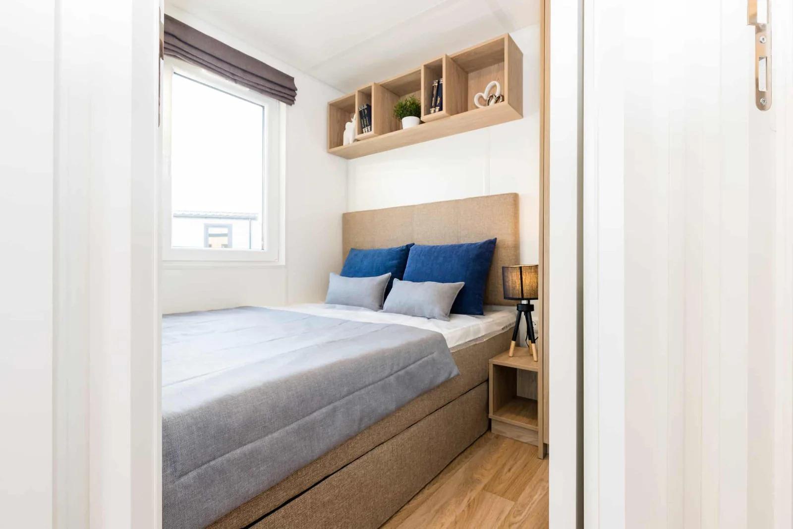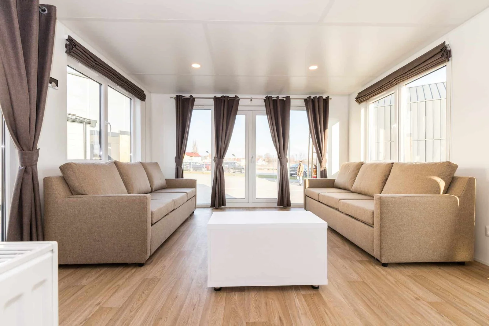 En el interior, las paredes y techos están revestidos en PVC, un material higiénico, duradero y de fácil mantenimiento. El pavimento de linóleo con acabado imitación madera ofrece resistencia al desgaste y una estética cálida. La iluminación LED, tanto interior como exterior, garantiza eficiencia energética y larga vida útil.