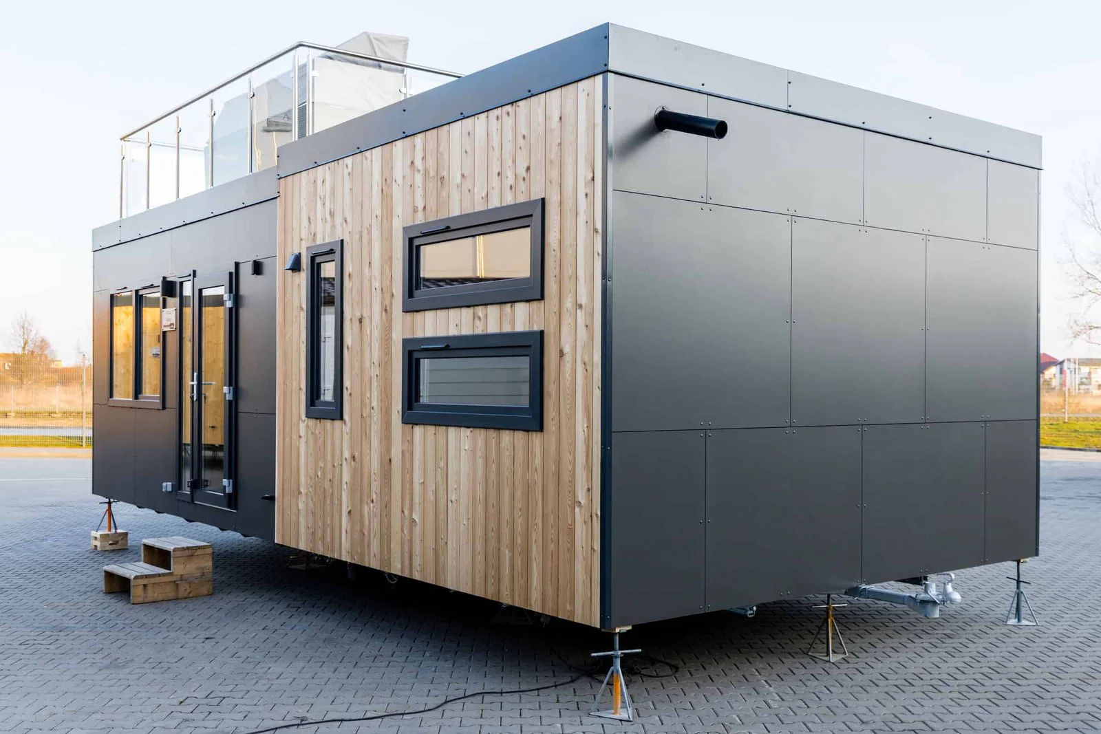 El conjunto se apoya sobre un chasis estructural robusto, tratado contra la corrosión, garantizando estabilidad, resistencia mecánica y larga vida útil. La estructura portante mixta de acero y madera combina solidez estructural con un óptimo rendimiento térmico. La fachada sur, resuelta mediante panelado horizontal, aporta una estética contemporánea y funcional.