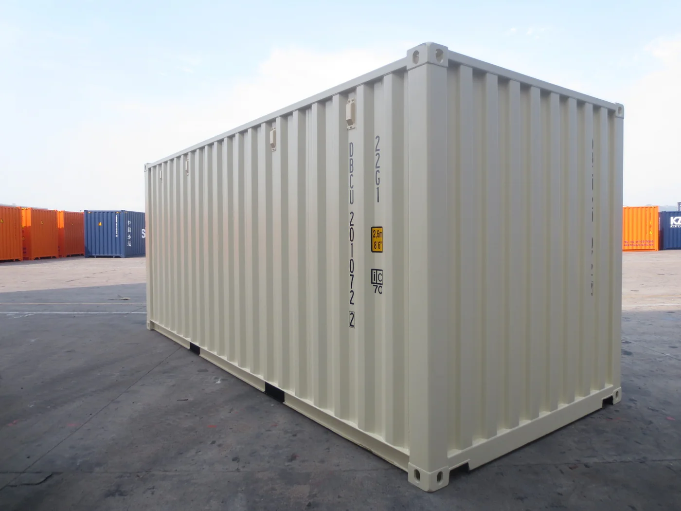 El contenedor de primer viaje de 20 pies es muy resistente gracias a su estructura de acero corten y su cubierta con cerradura, lo que garantiza la seguridad de los productos almacenados. Los laterales y el frontal son de chapa de acero con ventilación lateral, y tiene una puerta doble con rejillas de cierre. Estos contenedores son estancos y herméticos, con suelos de madera colocados sobre traviesas de acero.